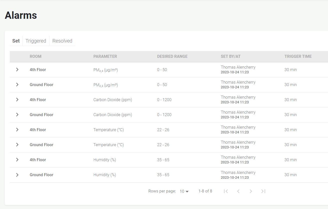 Alarms: The system was programmed to set alarms based on sensor data, instantly notifying building managers of any air quality deviations.