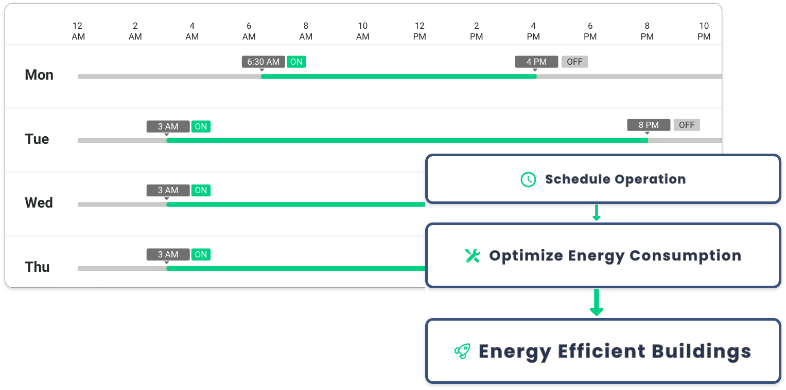 The Time Scheduling allows users to schedule the operation of their equipments based on specific time periods. This enables them to optimize energy consumption by aligning the operation of equipment with occupancy patterns and desired comfort levels, resulting in efficient and cost-effective building management.